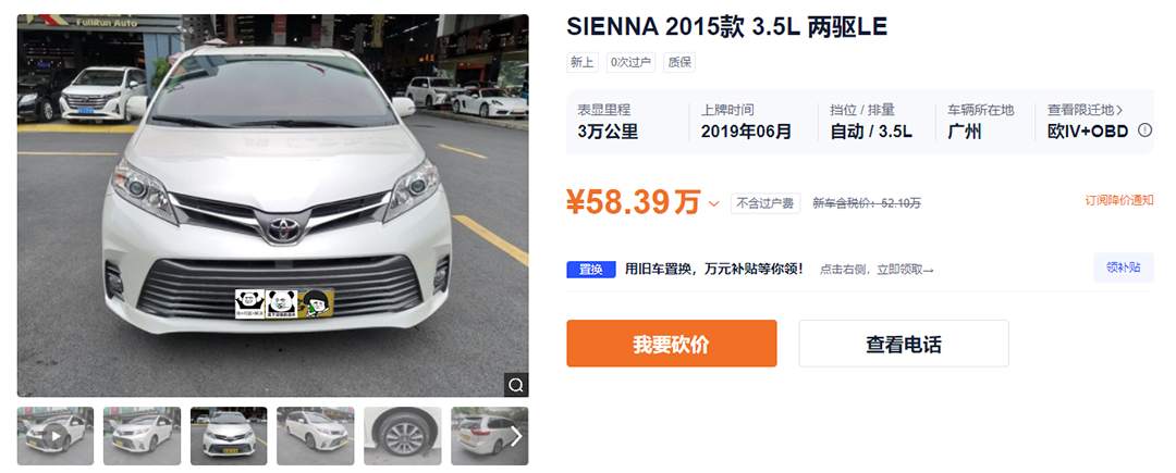 但是有趣的情况出现了,同样在某二手汽车平台上,一台新车含税价52.1万的2015款3.5L两驱LE塞纳开口要价58.39万。