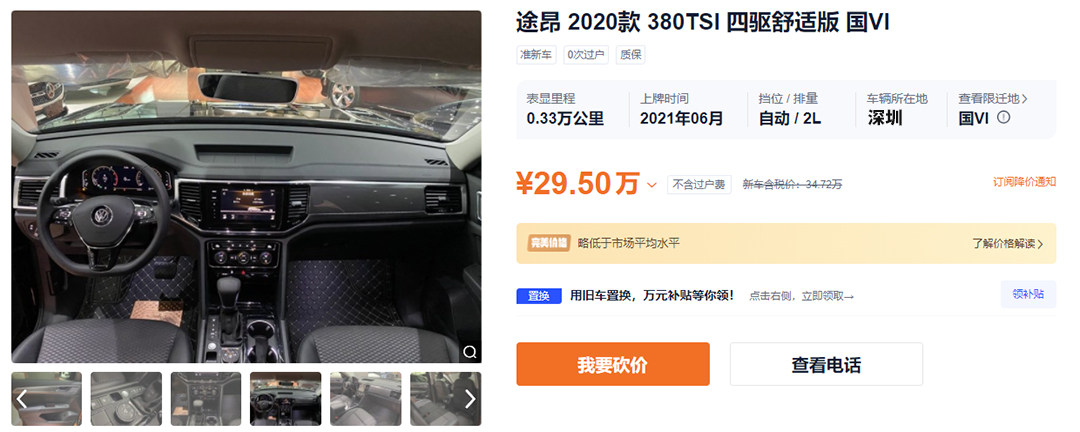 此时二手车的价格为29.5万,比新车落地便宜了6.3元,假设当时途昂新车的优惠给到3万(全国平均),那么现在二手价格也要比新车落地便宜了3.3万,这才是买二手车可以省出来的钱。