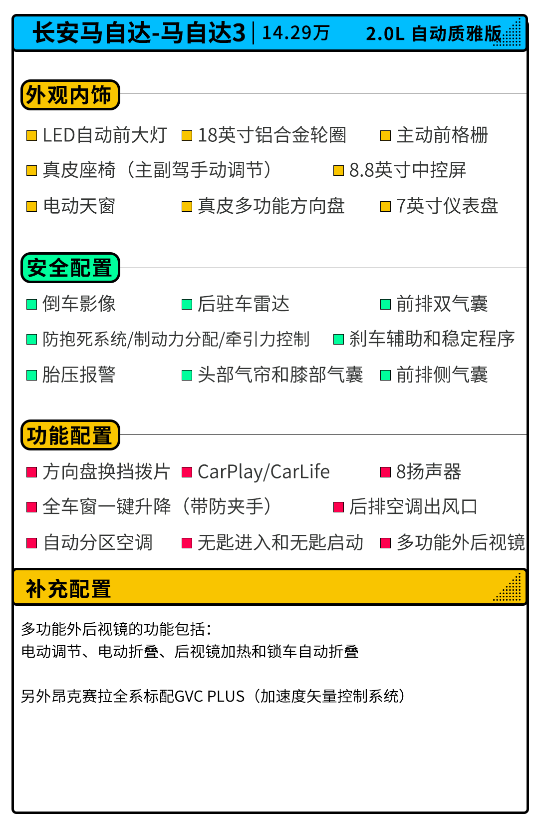 昂克赛拉2.0L自动质雅版的配置就比较齐全了,LED大灯和尾灯组的加持、更高端的内饰设计和真皮包裹内饰,再加上部分和驾驶员相关的配置,尤其是GVC加速度矢量控制系统的加入,昂克赛拉几乎可以说是为驾驶员服务的车型。