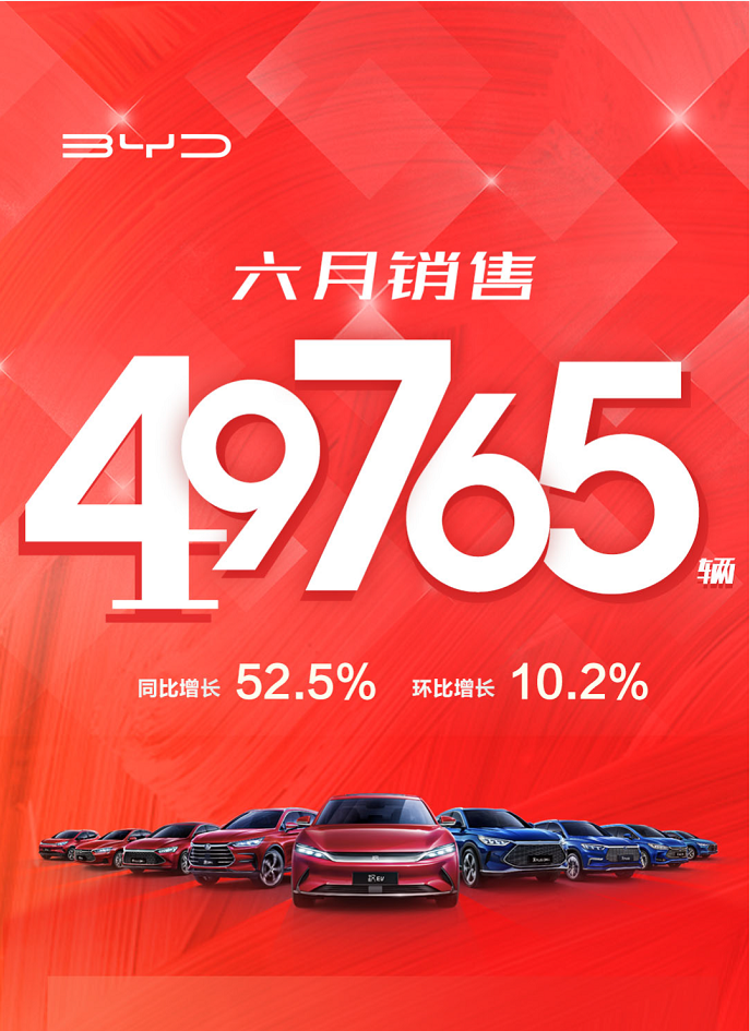 近日,国内自主品牌巨头之一的比亚迪汽车发布了6月份以及上半年的销量数据。据官方数据显示,比亚迪汽车六月份的销量为49765辆,同比增长52.2%,环比增长10.2%;比亚迪汽车上半年的销量数据为246689辆,同比增长55.51%。