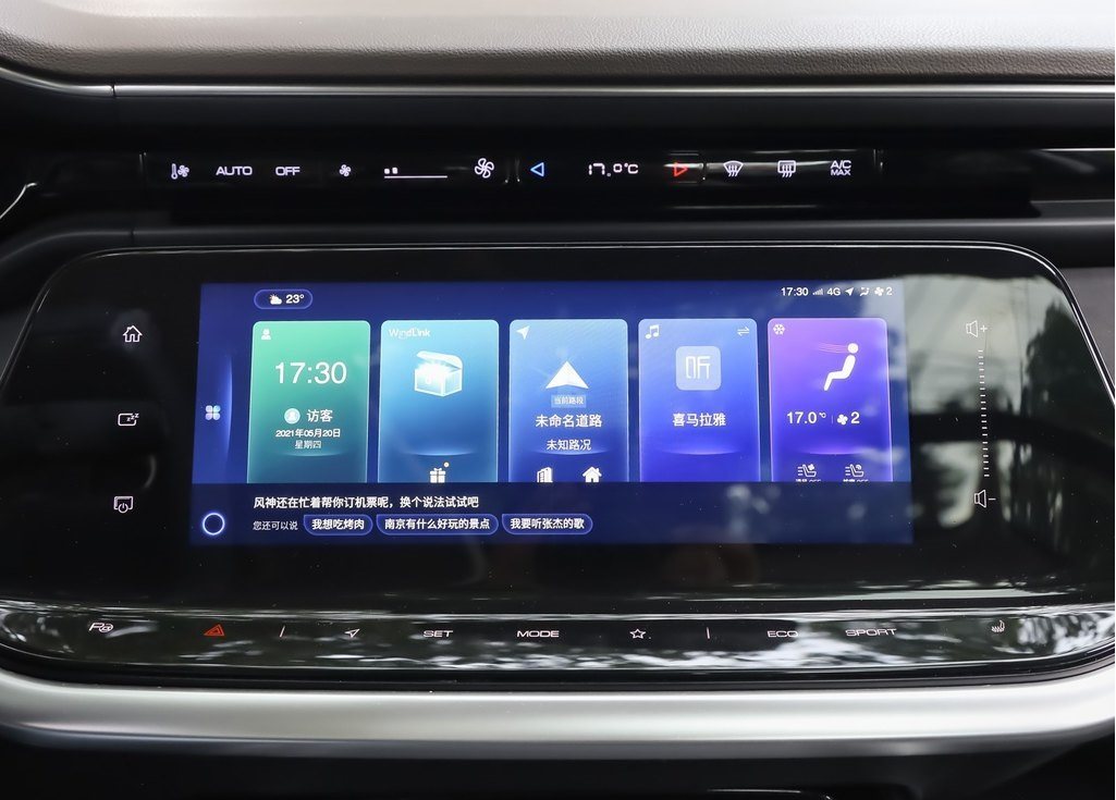 具体方面,新车配备三幅平底式多功能方向盘、全液晶仪表盘、电子挡把以及悬浮式中控大屏,科技感的呈现还是相当到位的,国产车一贯的特色。其中全液晶仪表盘可以支持多种显示主题切换,而中控屏内嵌WindLink6.0系统,支持丰富的在线音乐、K歌、导航、语音识别、百度CarLife和华为手机映射等功能。