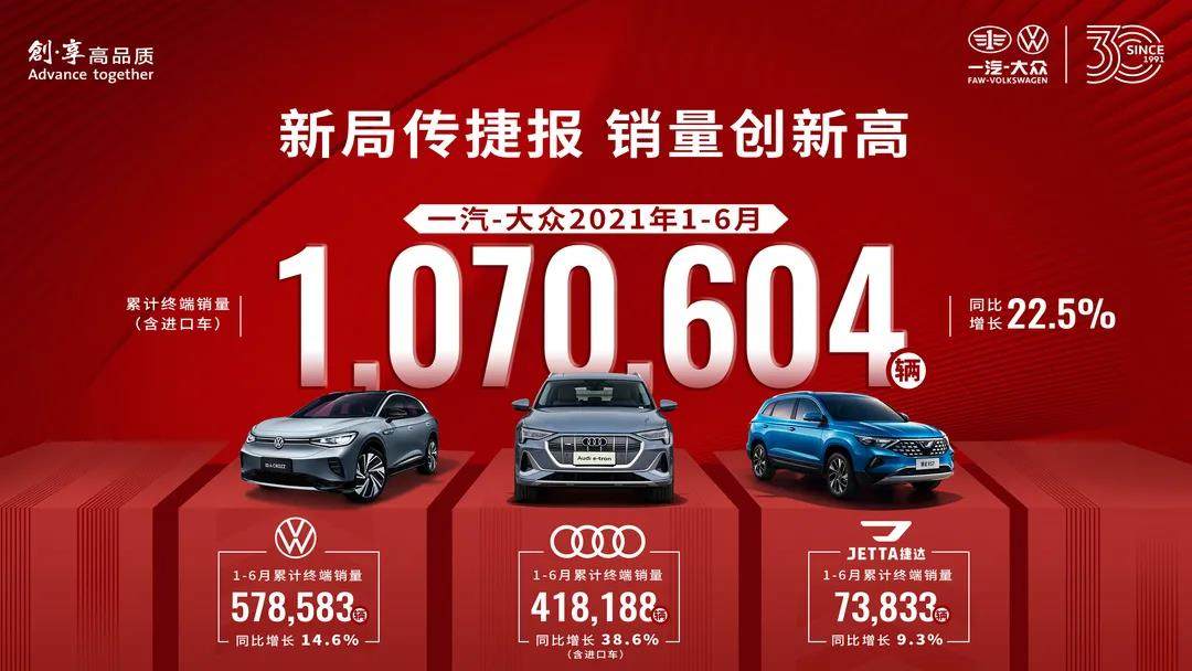 近日,今年三十而立的一汽-大众公布了其上半年的销量成绩。数据显示,今年1-6月,一汽-大众累计销量为1070604 辆(含进口车),同比增长了22.5%,成为了国内乘用车市场销量第一。值得一提的是,一汽-大众已经连续三年成为中国汽车厂商半程销量冠军。