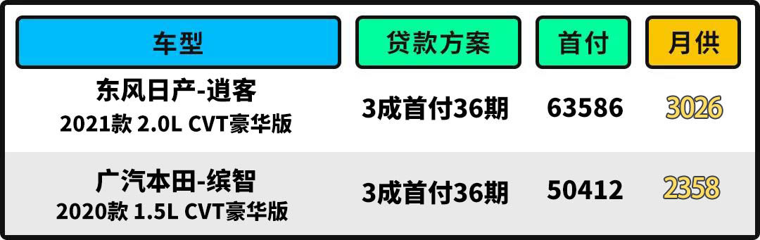 在贷款方面。两车同样以3成首付+36期月供的形式进行计算,逍客的首付为63586元,月供为3026元,而缤智首付为50412元,月供为2358元,两车月供相差668元,差距并不算大。