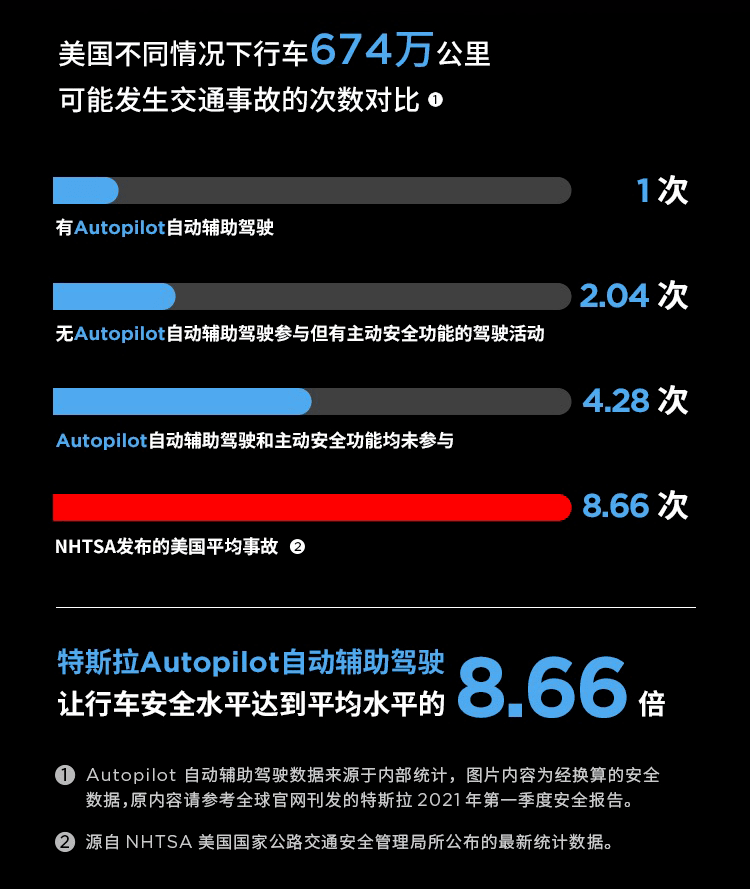 而美国NHTSA数据显示,全美道路交通中平均每78万公里即发生一起交通安全事故。特斯拉Autopilot自动辅助驾驶让行车安全水平达到全美平均水平的8.66倍!