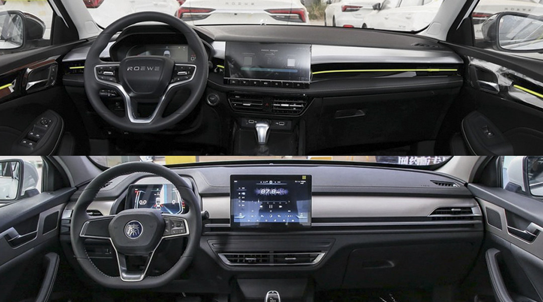 有趣的是,两款车的内饰有种异曲同工之妙,因为它们均选择了简洁的布局风格。这主要由三幅式多功能方向盘、悬浮式中控大屏、液晶仪表盘组成,而且均采用了电子驻车。但荣威i5在配色上更年轻,而秦Pro则延续了豪华大气的风格。