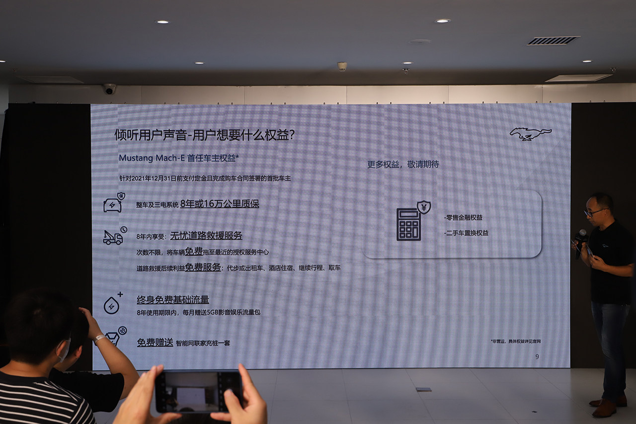 城市店开业现场,官方也正式公布了多项用户权益,在2021年12月31日前支付定金并且完成购车合同签署的首批车主,福特电动车将为其提供整车以及三电系统8年或16万公里的质保、不限次无忧道路救援6、终身免费的基础流量7、免费智能网联家用充电桩及配套安装服务。