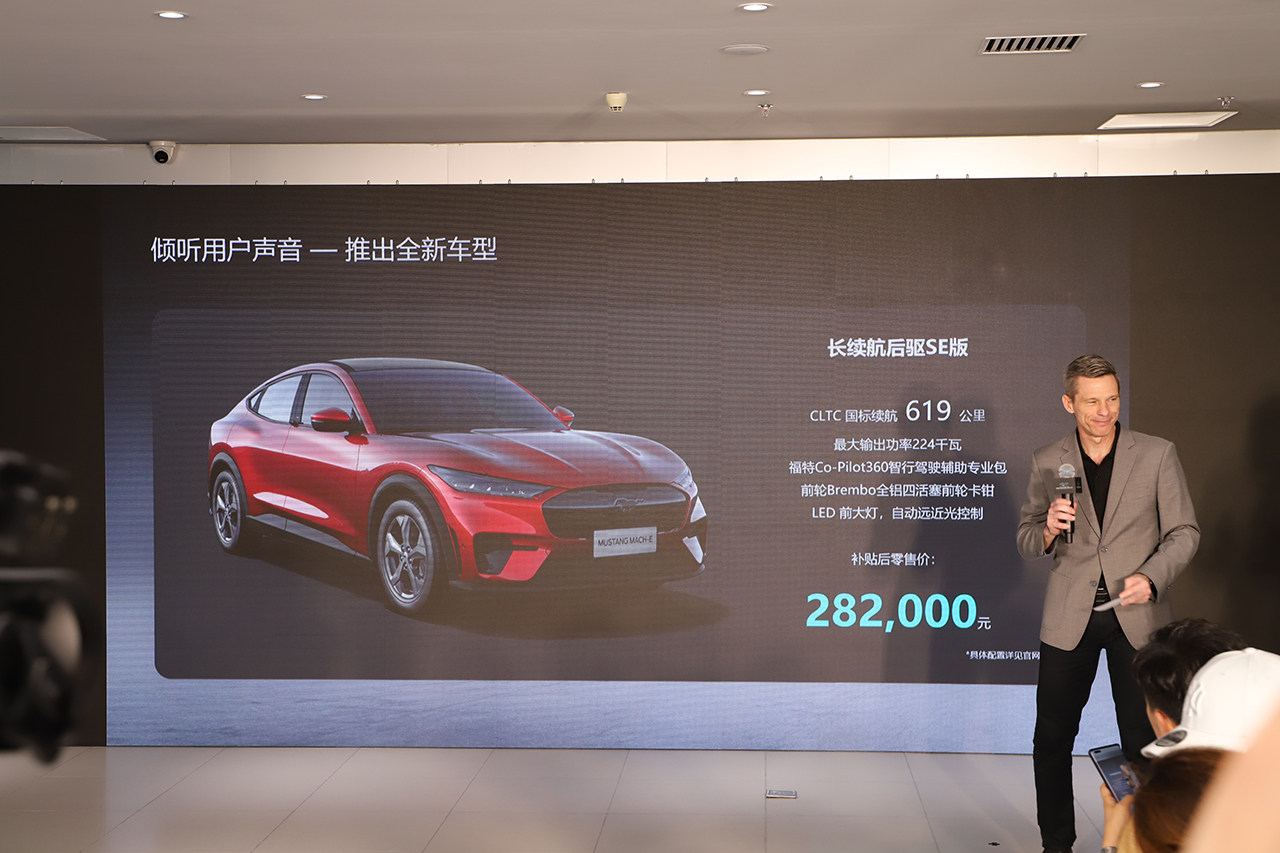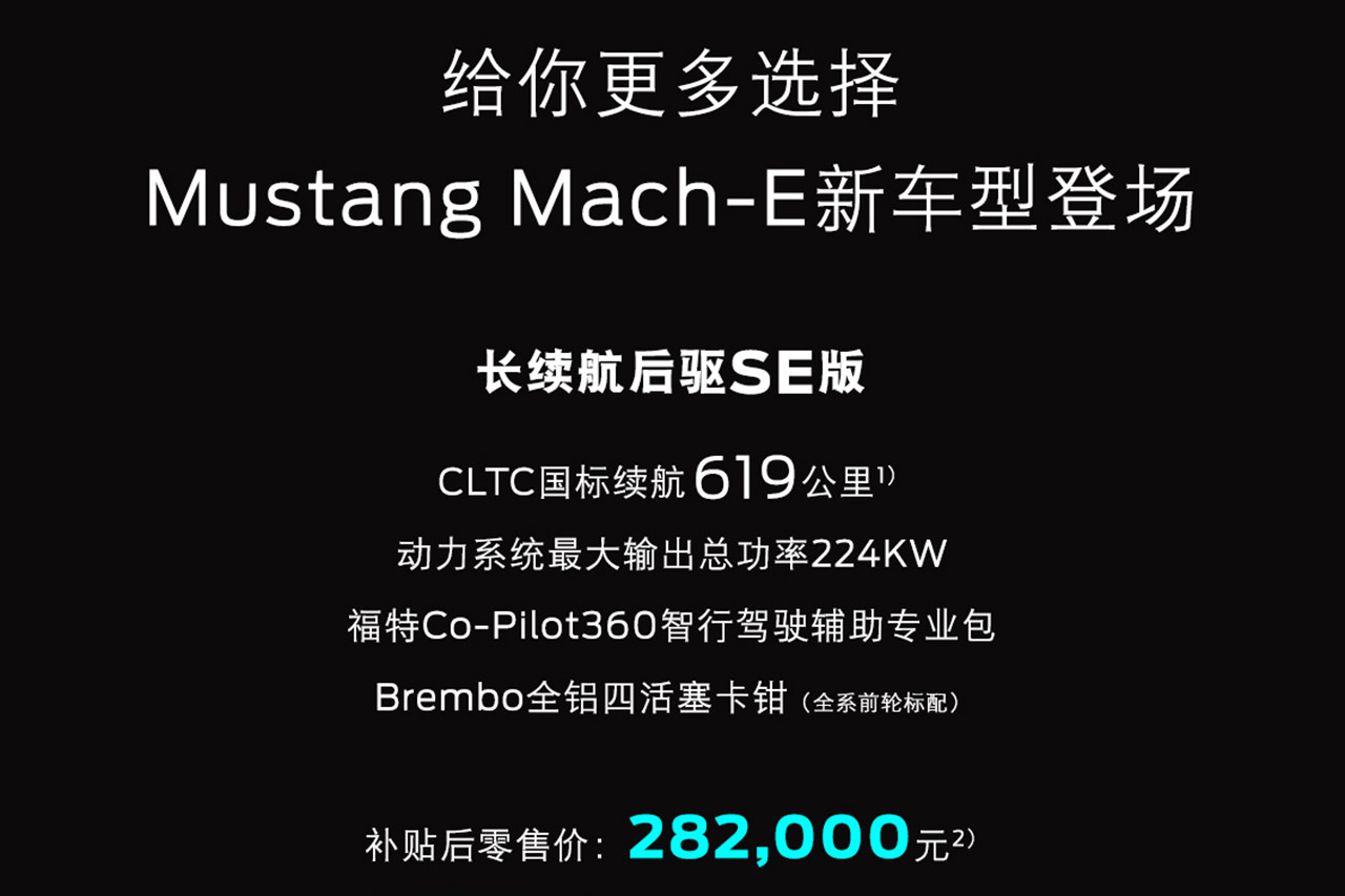 Mustang Mach-E整体的售价区间是26.50-37.99万元,此次新增的长续航后驱SE版本,售价定在了28.2万元,填补了26.5万元最低配和30.99万元长续航后驱版之间四万多的空白。配置上,长续航后驱SE版和标准续航后驱版并没有差异,主要区别就在于续航上,长续航后驱SE版的工信部续航里程为619km,比标准版本长了将近100km。