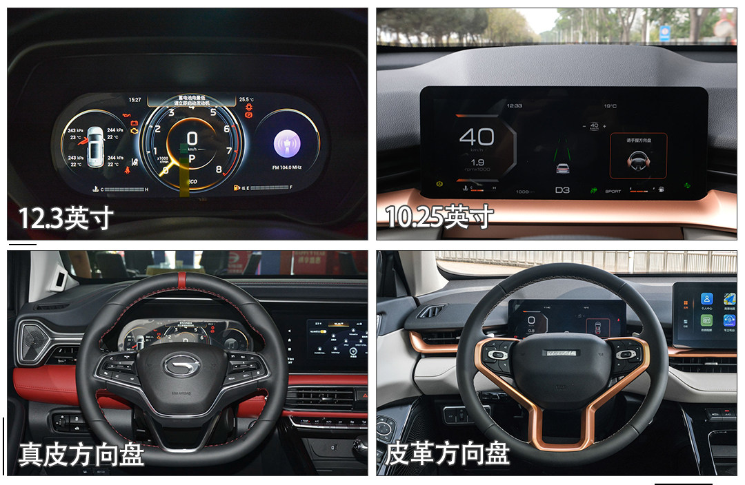 例如,哈弗H6是皮质方向盘,而传祺GS4为真皮方向盘,体验感会更好,更细腻;同为液晶仪表,哈弗H6尺寸为10.25英寸,而GS4为12.3英寸;主驾驶哈弗H6没有主驾驶腰部调节,并且副驾驶调节为手动模式,而GS4则为电动调节。