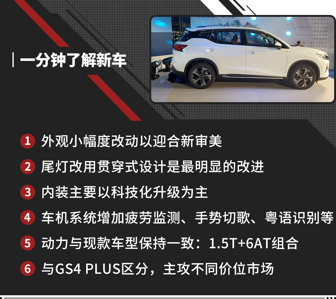 如今,新款GS4迎来中期改款,通过细节上的修改让车辆视觉效果更加时尚,同时引入更多智能化装备,让车辆在实际使用过程中有更优质的体验。
