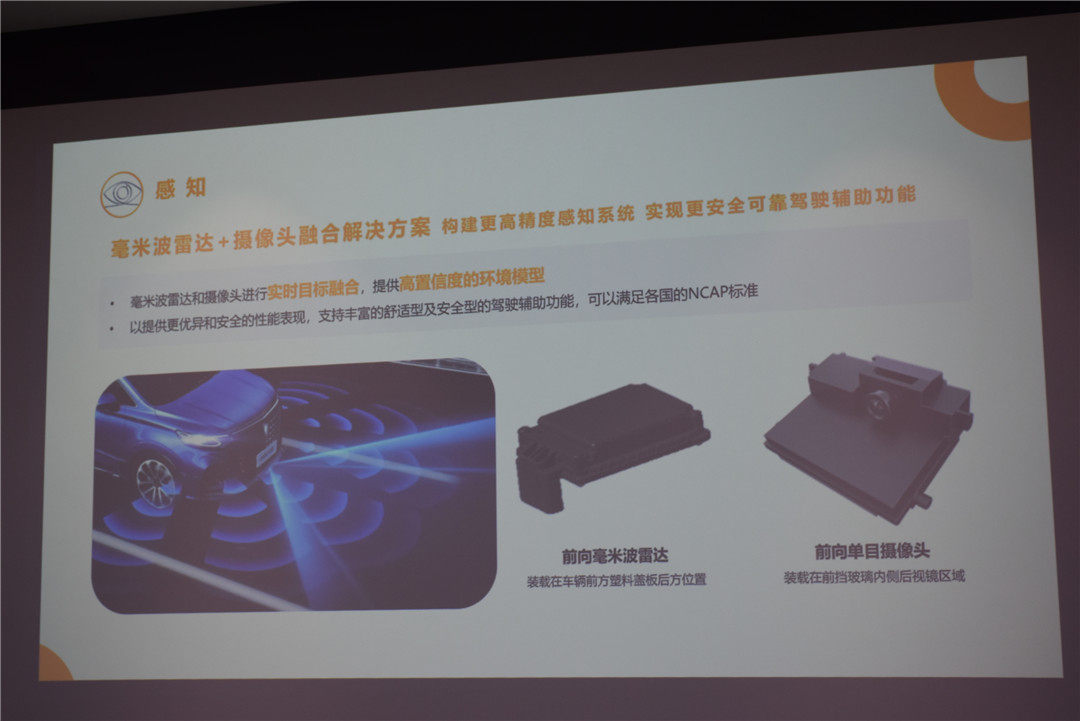 而采用的毫米波雷达+摄像头融合解决方案,构建了更高精度感知系统,实现更安全可靠驾驶辅助功能。装载在车辆前方塑料盖板后方位置的前向毫米波雷达和装载在前挡玻璃内侧后视镜区域的前向单目摄像头进行实时目标融合,提供高置信度的环境模型,可以实现更优异和安全的性能表现。