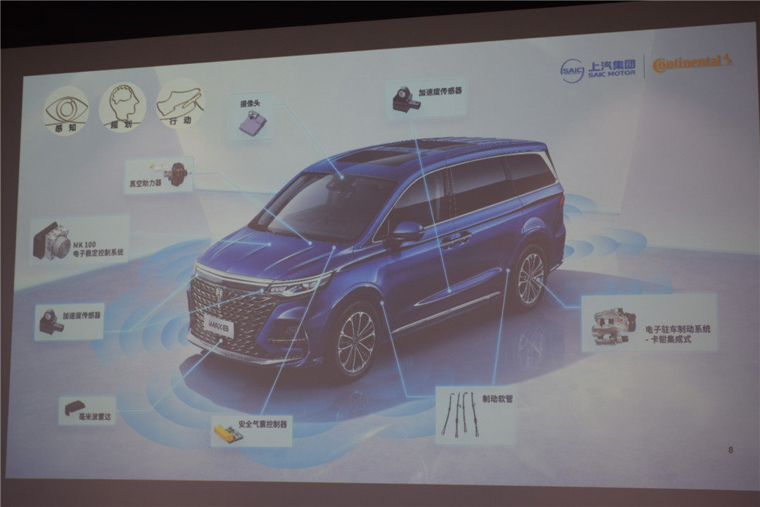 最后就是行动方面,荣威iMAX8感知周边环境数据分析规划好车辆行动后,车辆将通过大陆集团的电子驻车制动系统-集成式卡钳、真空助力器及制动软管产品,来进行行动方案的实施。