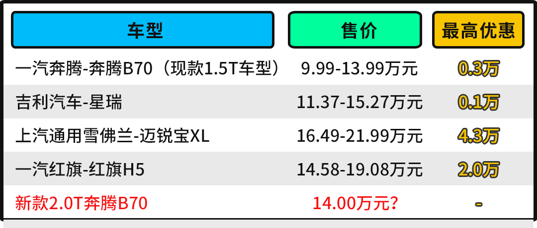 相比于这些,消费者或许更关注它的售价,目前现款售价区间为9.99-13.99万元,门槛算是同级别车型最低的,预计新款售价会超14万元。不过在买买君看来,14万元的售价显然是不利于奔腾B70在市场中的发展,同为2.0T排量的星瑞起售价才11.37万元,同级别且为合资品牌的迈锐宝XL优惠后售价也才12万出头,同时品牌号召力更强的红旗H5起售价也才14.58万元,如果能卖13万多,相信会有很多消费者愿意买单。