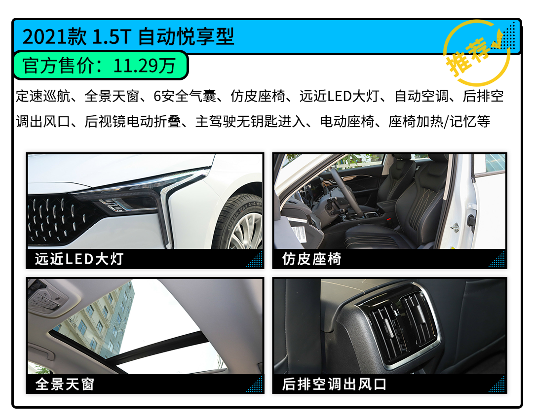 配置选择方面,推荐次低配的自动档车型——2021款 1.5T 自动悦享型,就是图个实惠,相比入门版车型,多了前排侧气囊、前后头部气帘、全景天窗、主驾驶无钥匙进入、电动座椅、座椅加热/记忆等配置,售价仅多了7000元;至于中配的尊享型,仅多了远程启动、7英寸仪表盘、后排杯架、智能双屏系统等,但售价同样多了7000元,性价比并不是很高。