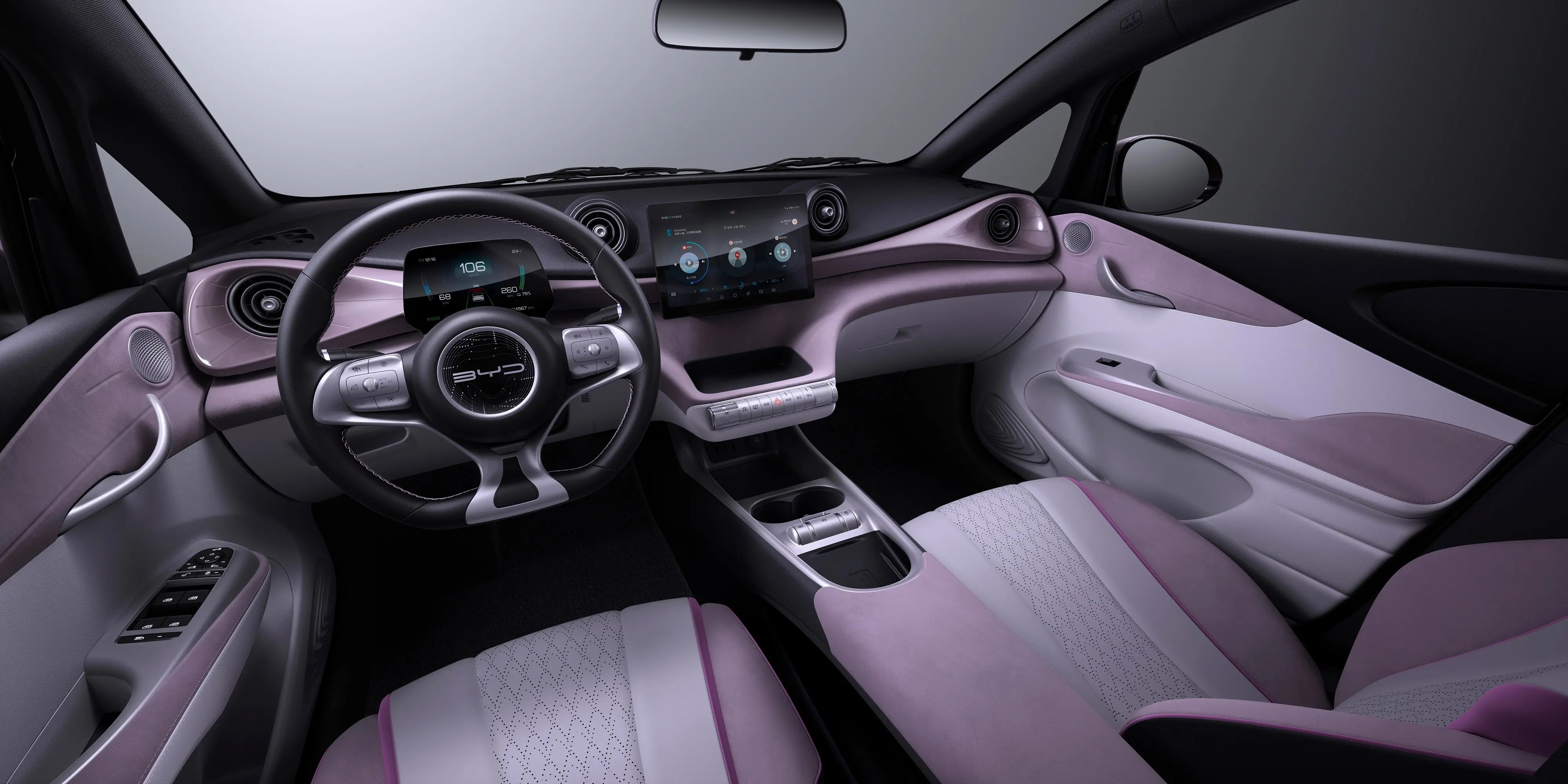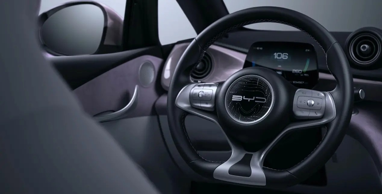除了在颜色上玩花样,海豚在内饰设计感也是非常独特的。内饰大量采用柔美的曲线设计,仪表台波浪的线条官方称其为逐浪式悬浮仪表台,曲线环绕包裹着圆形的出风口。仪表盘和中控显示屏依旧是采用悬浮式的设计,与全新设计的多功能运动方向盘搭配起来非常协调。值得一提的是,easy-going按键控制系统的细节非常精致,很有质感。