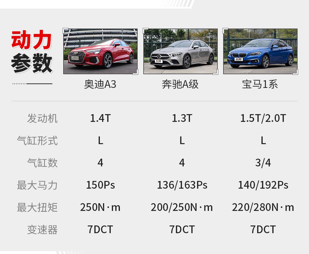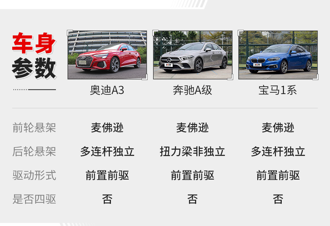 确实,相比宝马1系1.5T配了三缸,奔驰A级只给了扭力梁与1.3T的更低排量,换代后的奥迪A3显然态度更加端正。
