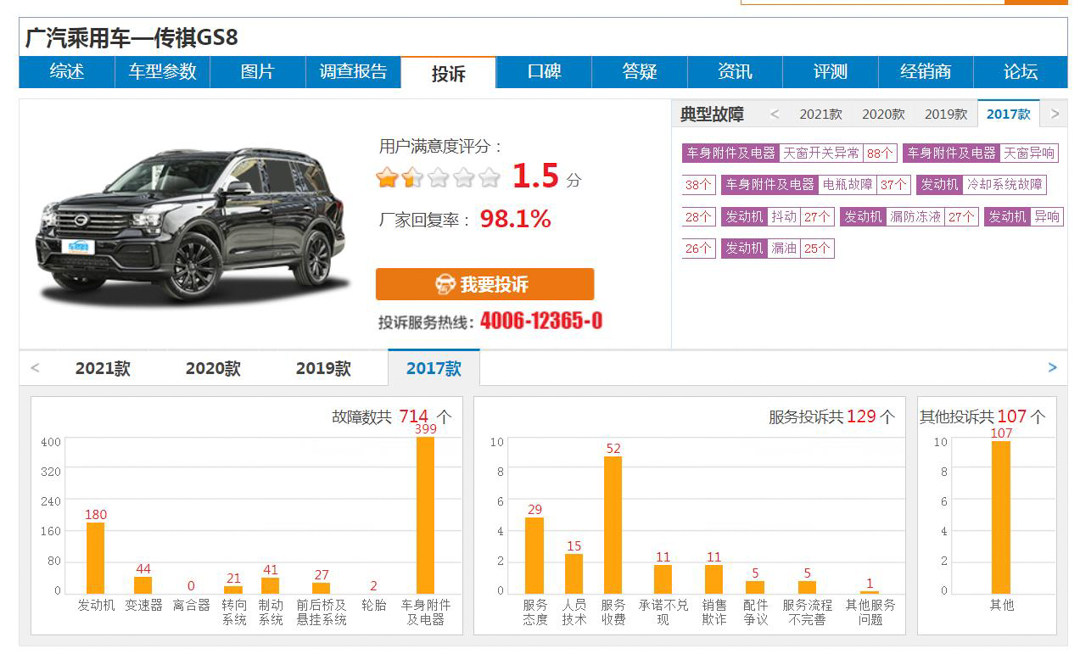 最关键的是,广汽传祺GS8还出现了大量的质量问题,以当年被很多人抢购的2017款车型为例,发动机、变速箱、车身电器等重要部件都有着较多的投诉,除此之外,经销商服务态度的口碑也较差,让不少消费者感到心寒。
