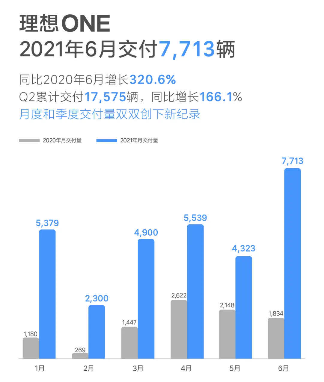 在此背景下,理想汽车能通过港交所上市聆讯,说明它靠的不是运气,而是自身的实力。根据理想汽车公布的数据来看,该品牌6月份交付了7713新车,均为2021款理想ONE,同比增长320.6%,环比增长 78.4%;今年上半年,理想汽车的总交付量达到30154辆。