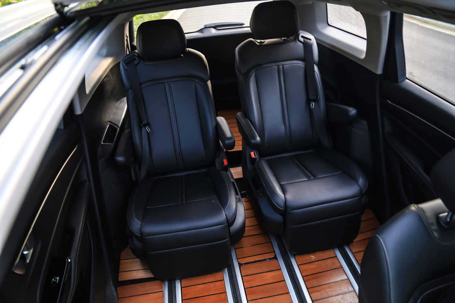当第三排不坐人的时候,完全可以把第二排座椅移到最后,腾出一个非常宽敞的腿部空间,再放平座椅靠背,升起腿托,足以媲美头等舱。