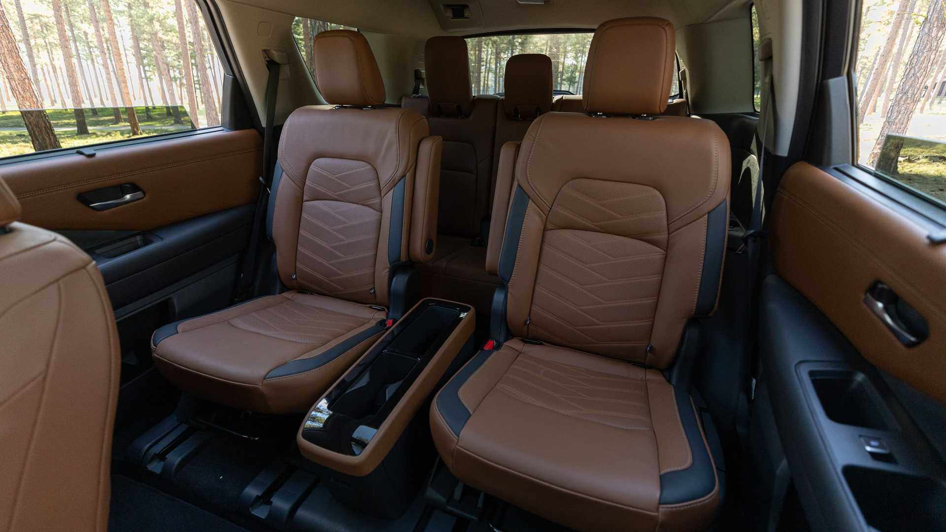 在座椅方面,Pathfinder提供2+3+2和2+2+3的两种布局,后者的舒适度尤其出色。如果单从腿部空间来对比,它确实不如其他同级选手,但实际上是因为第二排超大的独立座椅压缩了空间,坐起来依旧是“大沙发”的体验,足够柔软的填充完全将底盘的硬过滤了。另外,第二排中央还提供扶手和两个杯架,以及手机的储物盒,且非常容易拆卸,变成中央通道。