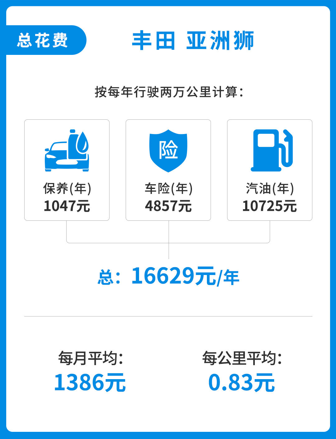 结合燃油、保养、保险来看,亚洲狮一年的养车成本仅16629元,平均下来每个月仅1386元,在A级轿车中算是比较经济实惠的产品。