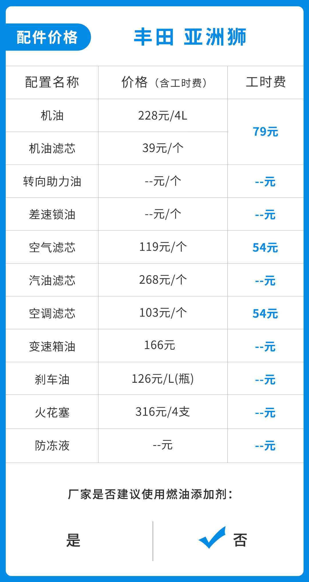 车辆14.28-17.98万的定价对比同级别的大众速腾(指导价13.59-16.59万)有着更高的购买门槛,而且丰田在终端优惠上也是向来没太高诚意,目前的亚洲狮的终端优惠仅6000元左右,而速腾的终端优惠高达25000元。在一众A+级车型中,亚洲狮都算得上是定价偏高的产品,而在购车时多出点,然后在日后的养车中省回来,这样的买卖划算吗?