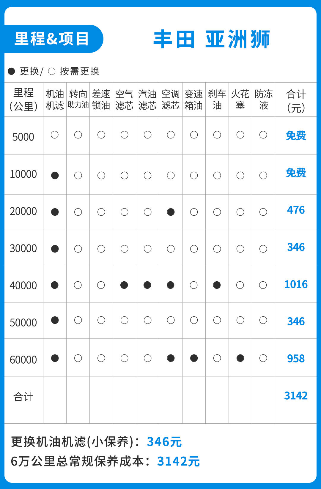 车辆的大保养出现在40000公里的时候,恰逢空调滤芯、空气滤芯、刹车油都需要更换,养车成本上会产生1016元的支出。3年60000公里下来,亚洲狮的养车成本一共是3142元,平均每年1047元;相较大众等一些德系或美系品牌养护成本还是相对较低的。