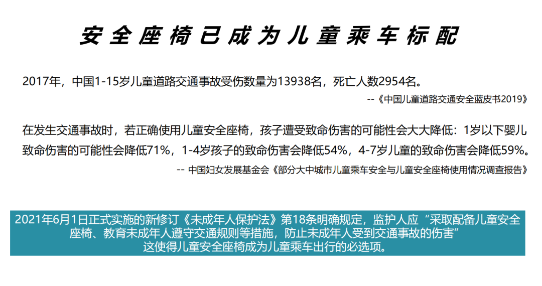 不过这种情况很快就会得到解决,今年6月1日,新修订的《中华人民共和国未成年人保护法》正式实施,对未成年人交通安全提出了新的规定,其中,使用安全座椅首次纳入立法,彰显了国家层面对儿童安全出行的重视,同时意味儿童安全座椅成为儿童乘车出行的必选项。