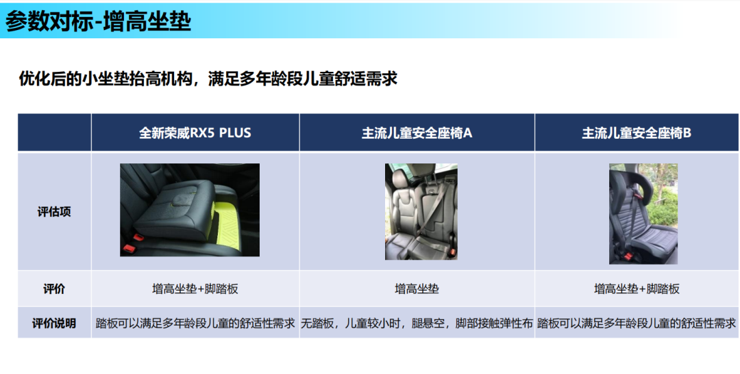 另外,全新荣威RX5 PLUS的全球首款量产集成式儿童安全座椅还搭载了增高坐垫+脚踏板结构,坐垫高度为190mm、总宽为390mm、纵深为350mm,提供更优坐姿舒适度,配合可以满足多年龄段儿童舒适性需求的脚踏板结构,让孩子出行过程中坐得更舒服。