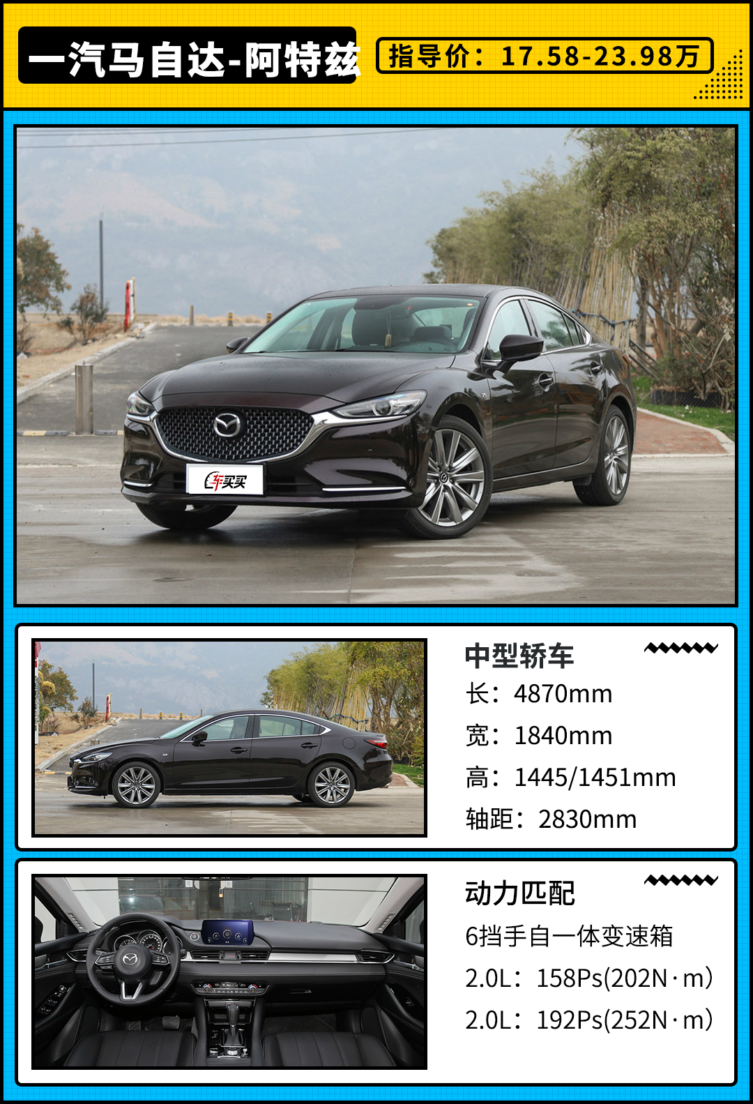 阿特兹17.58万-23.98万官方售价虽说与“日系三剑客”本田雅阁、丰田凯美瑞并没有占任何价格优势,但现时阿特兹车型最大拥有有2.6万现金优惠,阿特兹入门版车型只需15.98万元,入门版车型无疑拉低了B级运动轿车的入门门槛,用紧凑型高配车型的价格就能入手中型车,正是因为阿特兹入门版车型的存在,让普通人更容易触碰到运动B级轿车。