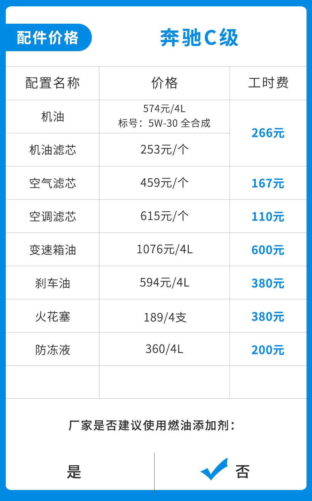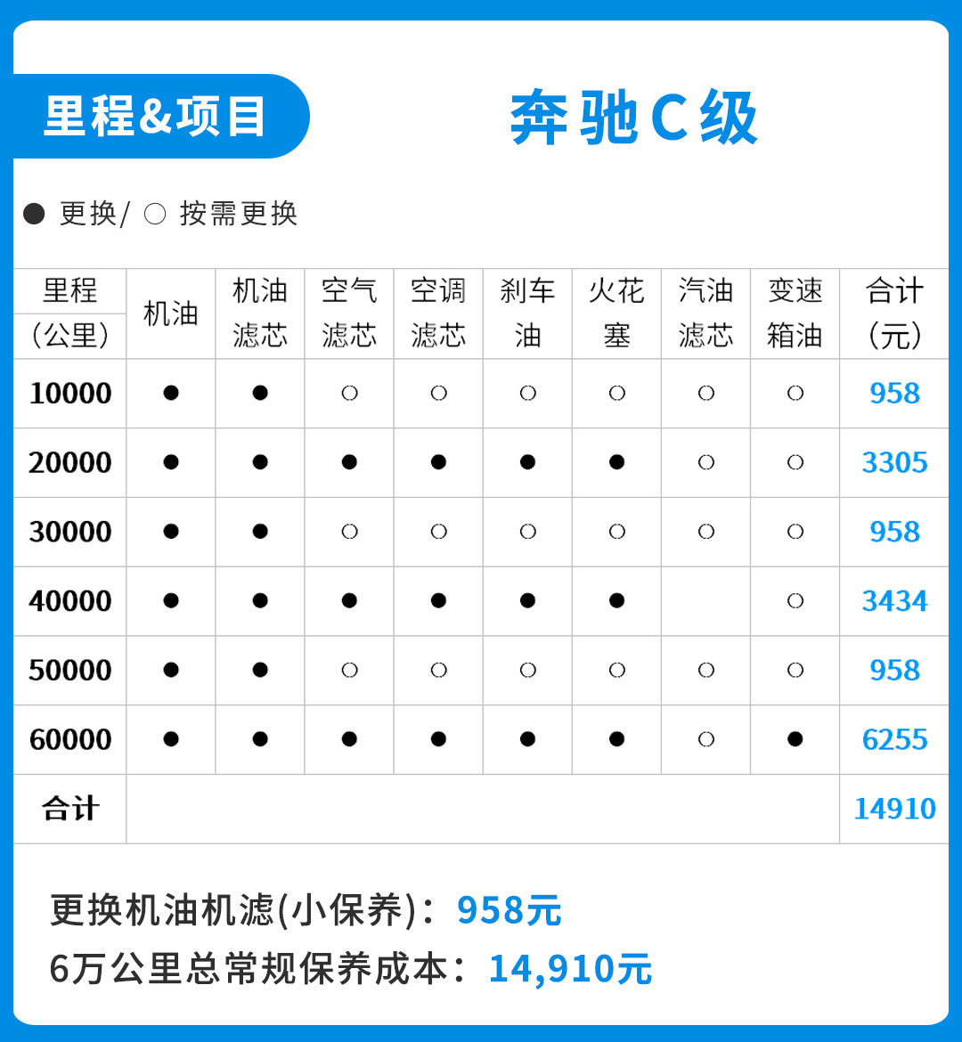 根据厂家建议,奔驰C级的保养周期为每10,000公里一次,其中更换机油机滤的小保养费用为958元,而更换火花塞、刹车油的大保费用为6,255元。