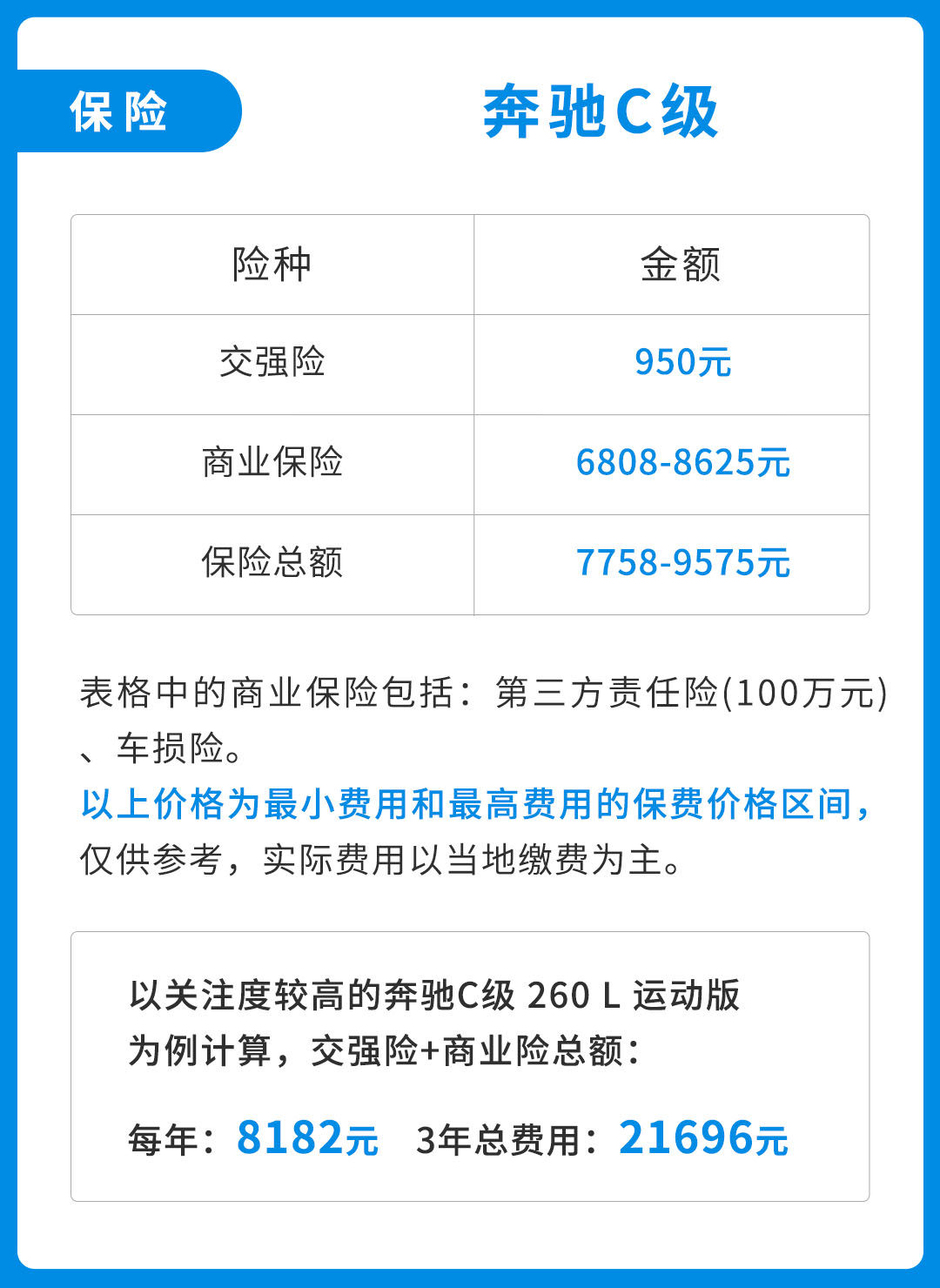 以关注度较高的“奔驰C级 260 L 运动版”为例,一年的保险费用为8,182元。