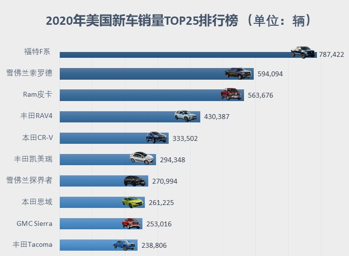 其次,由于国情以及实际的用车环境,拥有高通过性和强大装载能力的SUV、皮卡才是美国消费群体最为热衷的车型,从美国本土年度TOP25销量榜单也可见,前五都是被SUV、皮卡车型所包揽,而仅有的两款家轿也是主打经济性的丰田凯美瑞、本田思域,那定位更高的家轿自然成为“小众”车型。