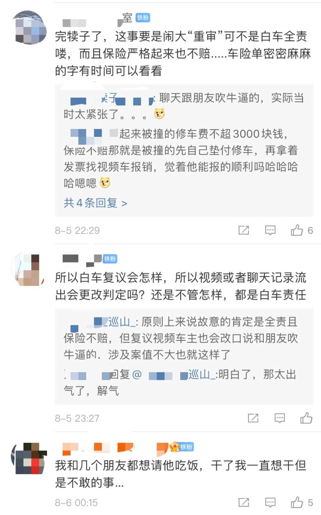 更有一些网友建议白色车主拿着视频和视频车主的聊天记录去复议,原则上来说故意撞车肯定是有责任的且保险公司可以不赔。但小编认为视频车主也是可以改口说和朋友吹牛逼,同时解释自己是被吓到了,忘记脚踩的是油门,他本来想踩刹车的。