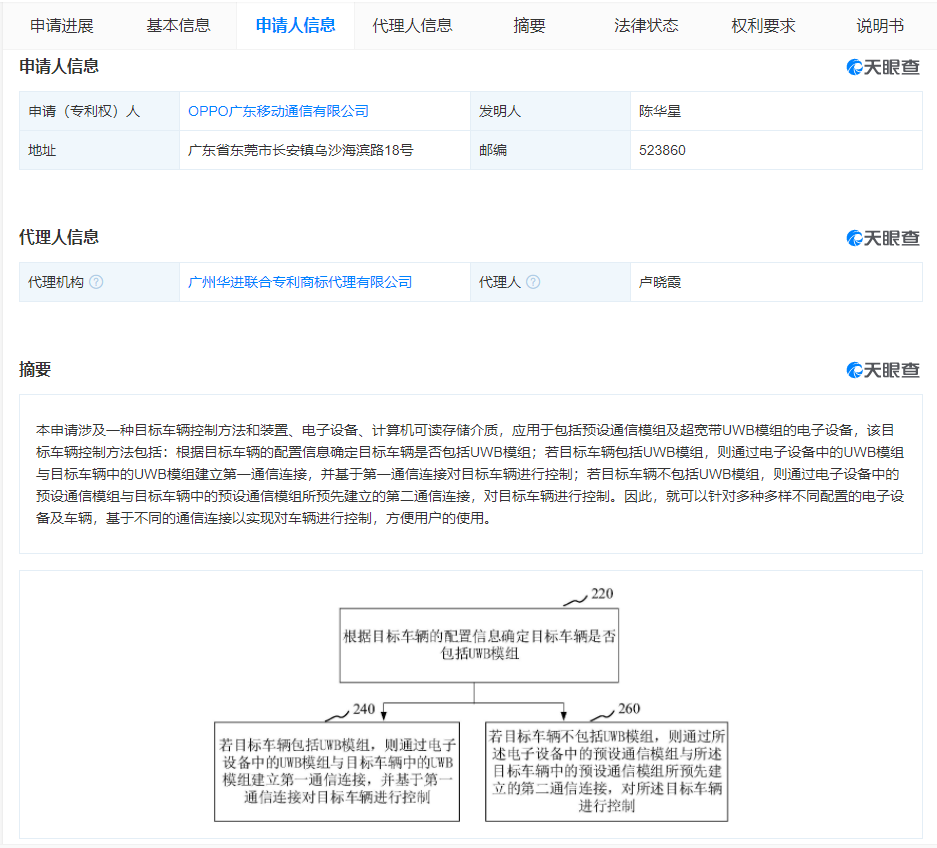 此前,OPPO公开了“车辆控制方法和装置、电子设备、计算机可读存储介质”专利,该专利摘要显示,本申请涉及一种目标车辆控制方法和装置、电子设备、计算机可读存储介质,应用于包括预设通信模组及超宽带UWB模组的电子设备。可以针对多种多样不同配置的电子设备及车辆,基于不同的通信连接以实现对车辆进行控制,方便用户的使用。