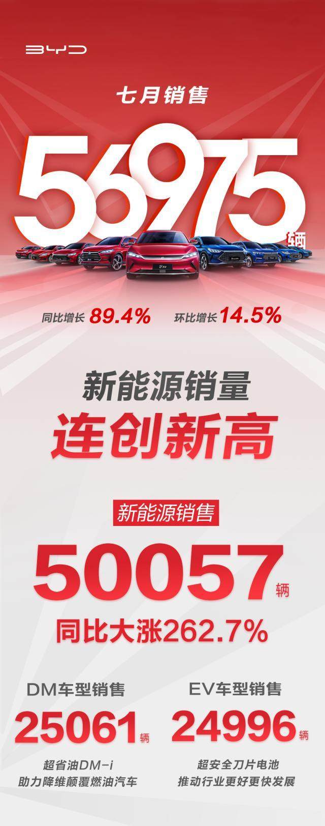 近日,比亚迪官方正式发布7月产销快报,数据显示,比亚迪当月全系车型共实现销量56975辆,同比增长89.4%,环比增长14.5%。