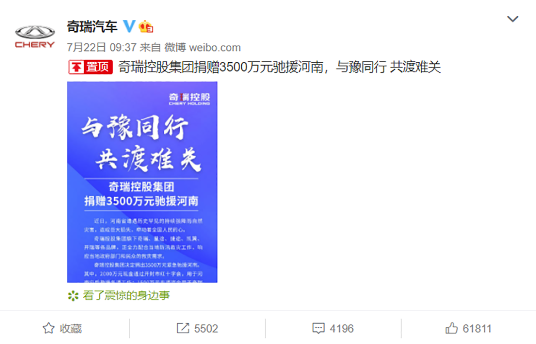 尽管这笔钱是由奇瑞控股集团拿出,非奇瑞汽车,但一下子捐出5个奇瑞汽车2020年的净利润,确实是社会责任比赚钱更重要了。