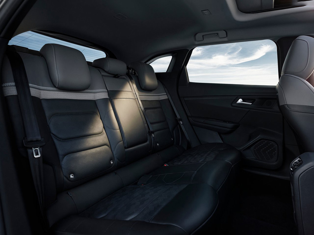 后排座椅得益于溜背式的车顶,头部空间以及开扬感都得到了保障,2785mm的轴距也保证了后排腿部空间,中央地台不算高,即便三人乘坐也不会难受。