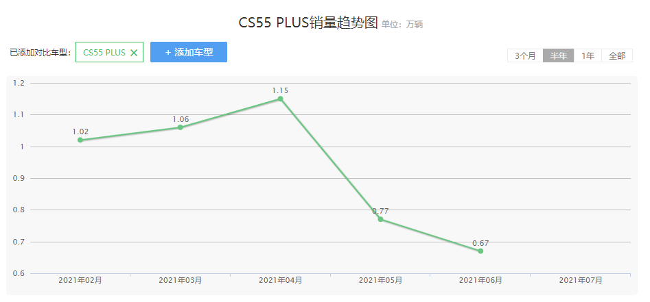从过往半年的销量数据可以看出,长安CS55 PLUS在头几个月的月销量数据稳定在过万台次的水准。虽说5-6月份的月销量趋势稍显回落,但6-7千的月销量水准依然使得长安CS55 PLUS的竞争地位不容小觑。
