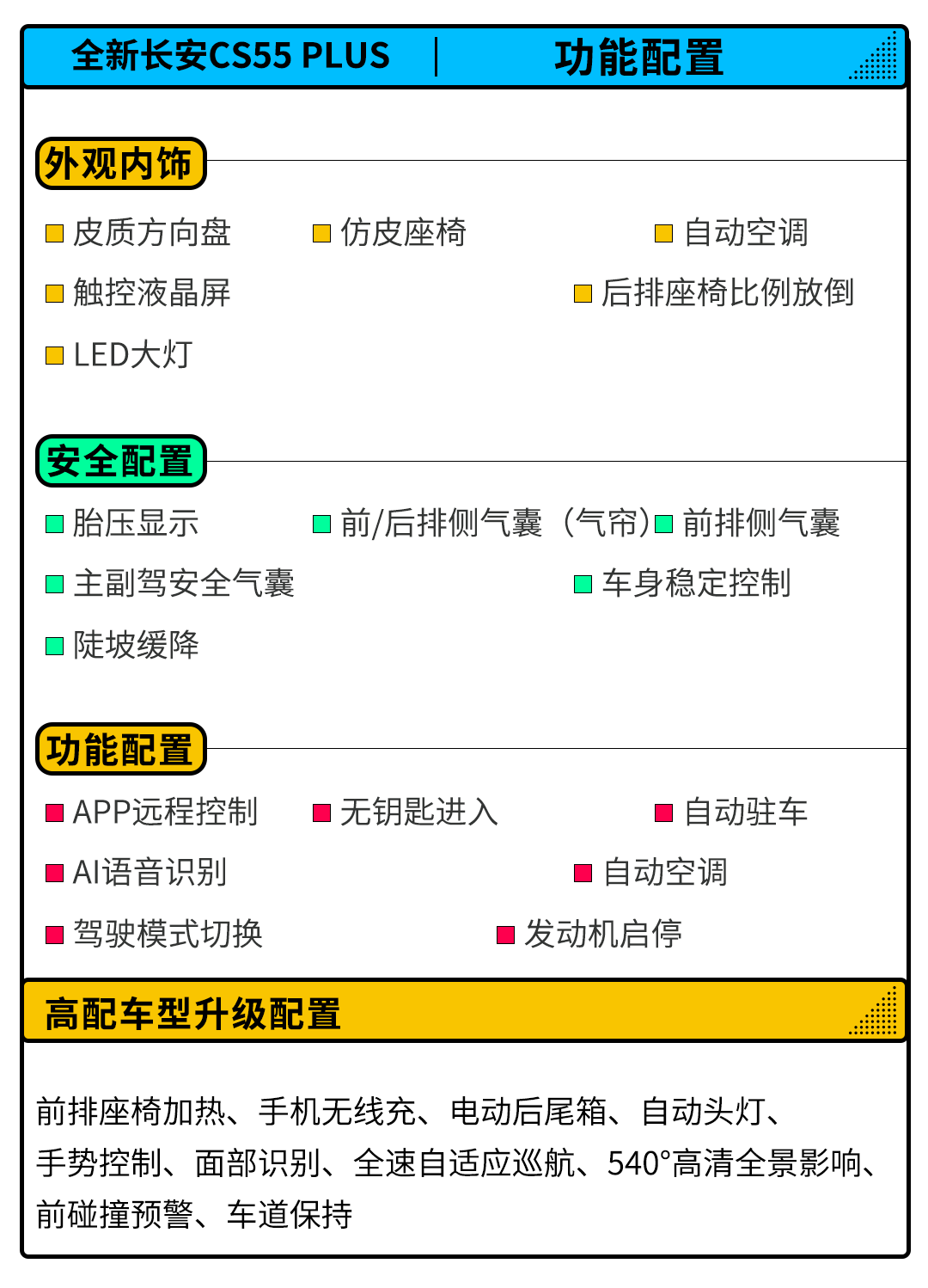 通过上述的表格可以看出,新车在智能化科技配置上标配了APP远程控制、AI语音识别等功能配置,无钥匙进入、倒车影像、自动空调等主流配置功能也得到了标配。除此之外,高配车型还升级和增加了自适应巡航、540°高清全景影响、前碰撞预警等多项智能驾驶辅助功能。