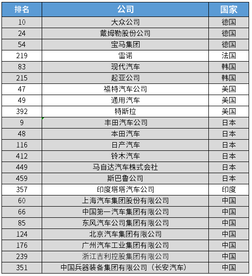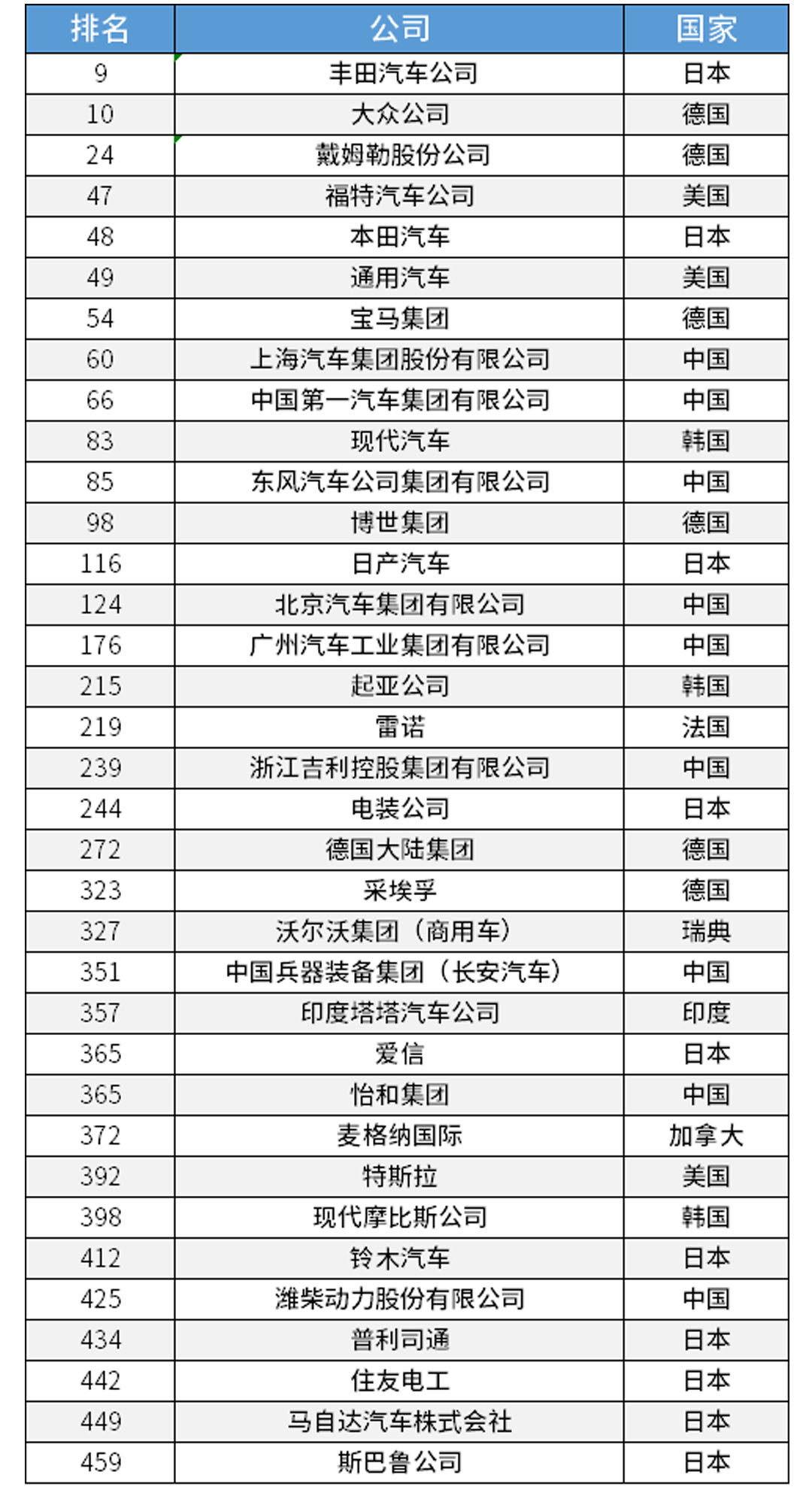 在7家入围的中国车企中,“上海汽车集团股份有限公司(简称上汽集团)”排名最高,全球第60名;“中国第一汽车集团有限公司(简称一汽集团)”紧随其后,排名第66位;“浙江吉利控股集团有限公司(简称吉利)”则是唯一一家入榜的民营车企,而另一民营巨头比亚迪,则遗憾落选。