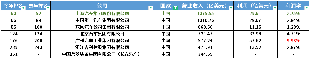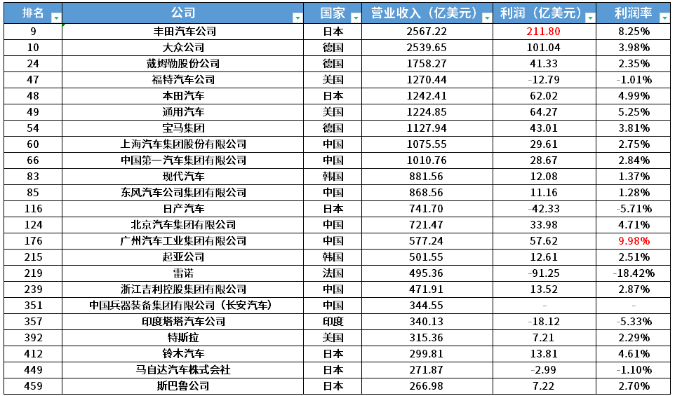 在入榜世界500强的7家中国车企中,排名最高的是上汽集团,全球第66名;而最会赚钱的则是广汽集团,去年的利润为57.62亿美元,利润率为9.98%,是世界500强中利润率最高的车企。