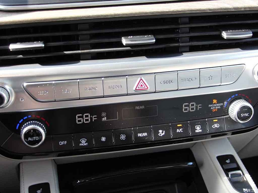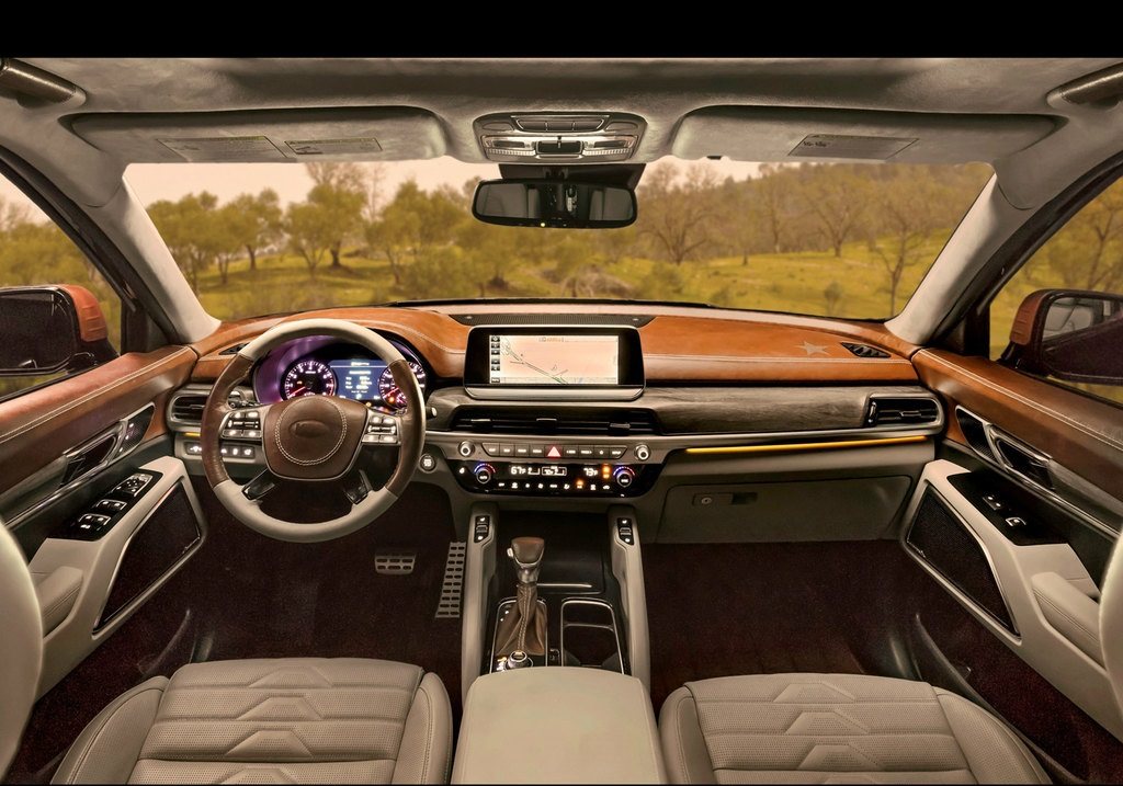 不过和刚猛的外观造型相比,起亚Telluride的内饰造型还是比较收敛,整体设计风格是熟悉的味道,在起亚多款车型上都能看到相似的设计,比如传统双圆式机械仪表盘、悬浮式中控屏、四辐式多功能方向盘及线条平直的对称式仪表台等,虽没有采用家族式最新的双连屏设计,但讲究的内饰用料弥补这些差距,像皮革包裹的中控台以及木纹饰板也应有尽有,比起同级别的车型更显豪华。