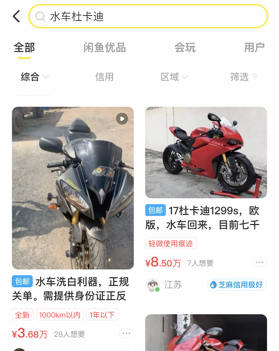 在闲鱼这样的二手交易平台上,若是搜索“杜卡迪 水车”则能找到不少这样的水车,所以这在市场是普遍存在的,也是一个监控的盲区。