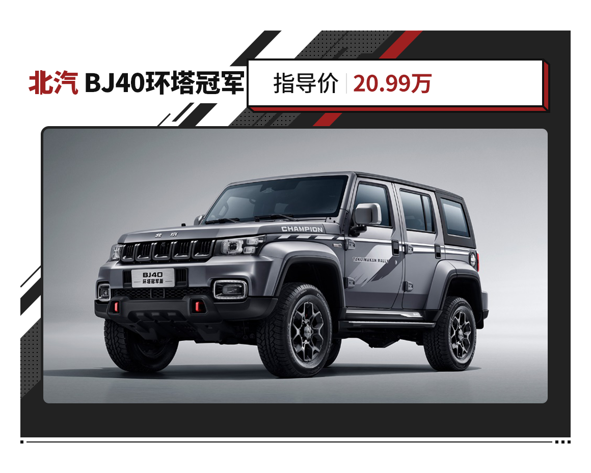 当然,在认清现实后,也不失有款售价仅为20万出头的国产硬派越野车,可以承载起我们这个“梦”,它就属北汽BJ40,为更契合越趋升级的消费市场,BJ40推出环塔冠军版,并于12日正式上市,官方指导售价为20.99万,全球限量2021台。
