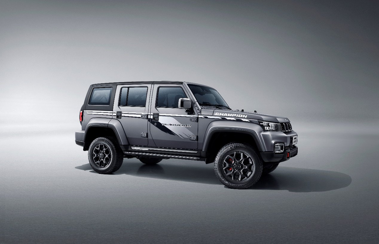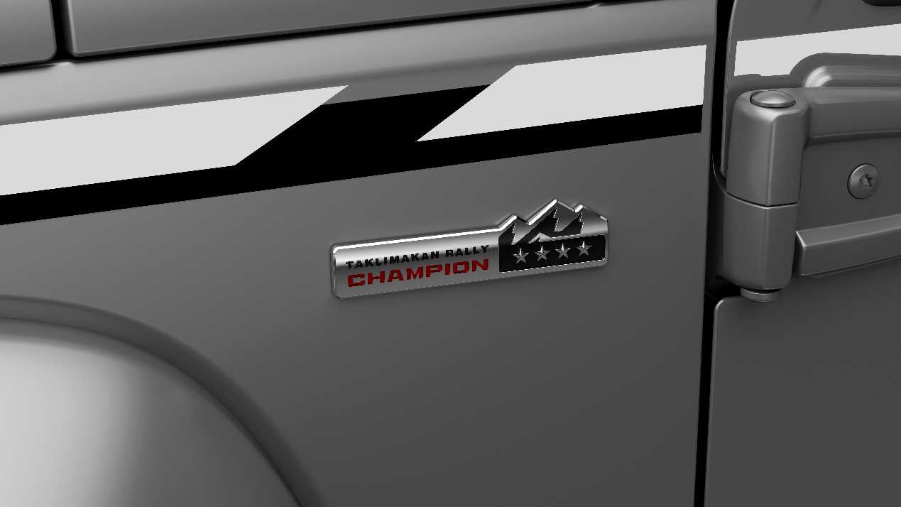 BJ40环塔冠军版涂装上象征大漠风情的暴风灰专属哑光漆色,并在车身周边增加一系列以“环塔冠军”为主题的身份标识,其中包括有车身拉花、冠军徽标、备胎罩等。