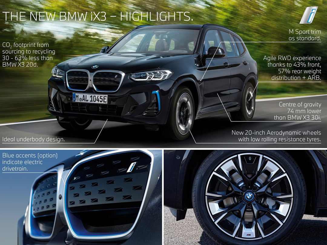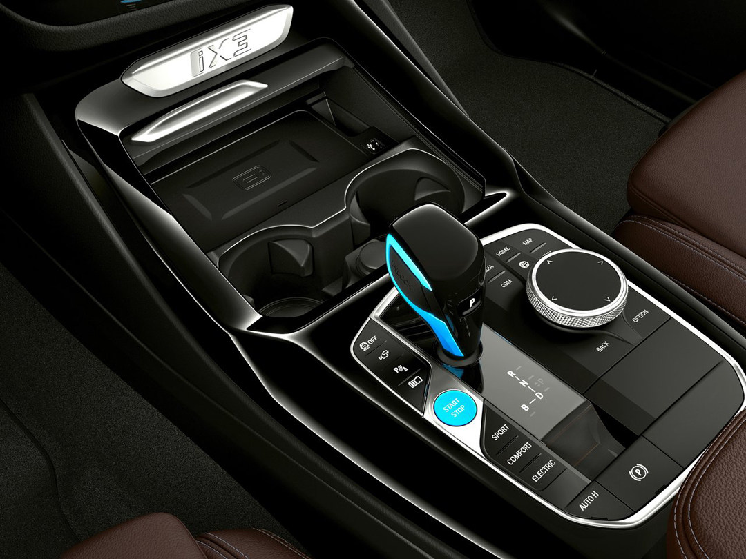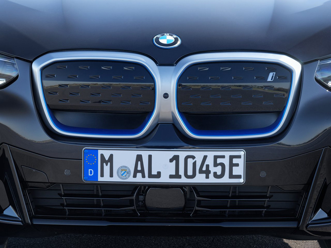 为了区别于燃油版车型,iX3使用了专属的雾面银搭配彰显新能源的蓝色饰条,双肾格栅采用半封闭式设计,并附上“i”字装饰。