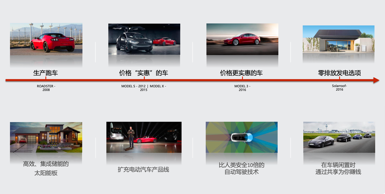 虽然特斯拉在智能电池车领域动作不断,但这些都是马斯克很早就设定的"秘密宏图"的一部分。曾在其公布的特斯拉"秘密宏图"中,马斯克曾明确了特斯拉的发展路径:生产跑车,然后用挣到的钱生产价格实惠的车,再用挣到的钱生产价格更实惠的车,在做到上述各项的同时提供零排放发电选项。