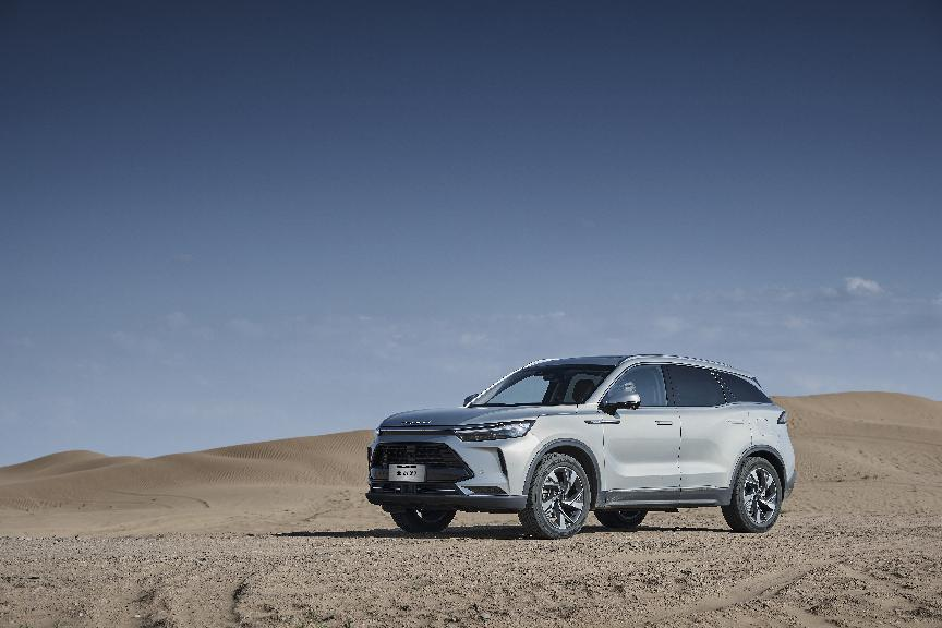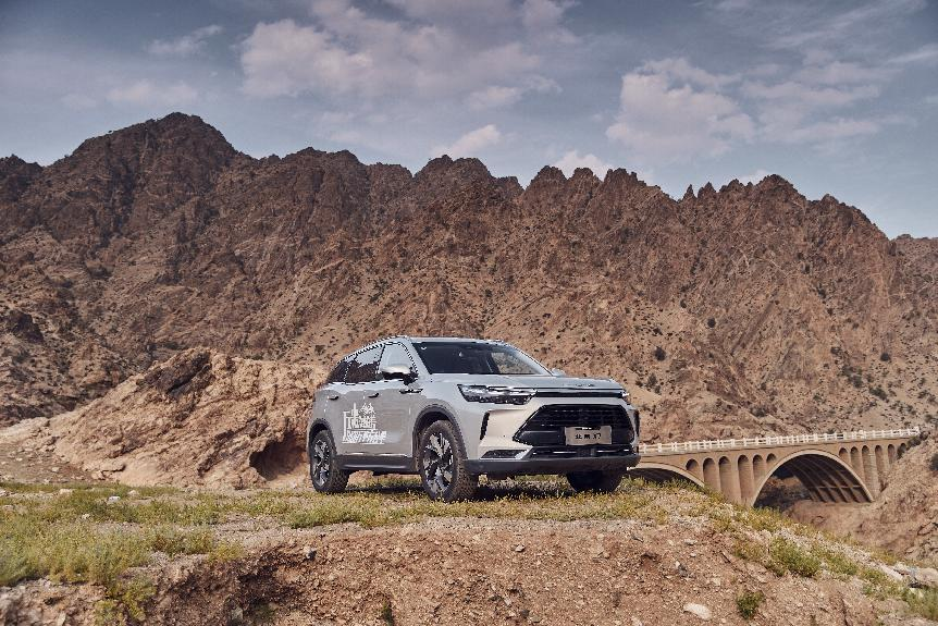 测试车队和嘉宾驾驶北京X7在这里进行沙漠高温挑战,戈壁路况驾驶挑战,以及100km/h的高速智能自适应巡航挑战。