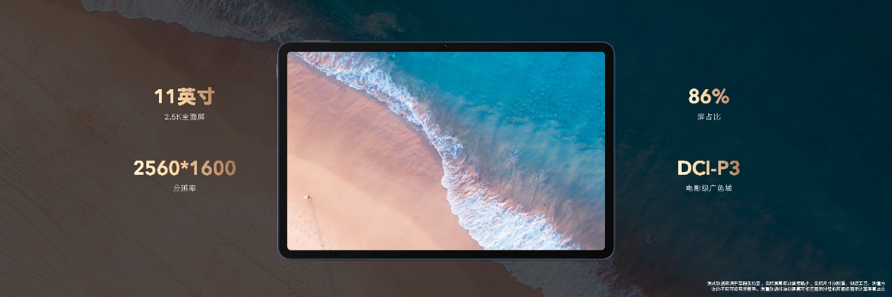 屏幕方面,荣耀平板V7 Pro搭载11英寸的2.5K超高清全面屏,采用16:10黄金比例、2560×1600超高清分辨率,并且支持DCI-P3电影级广色域,实现了86%的超高屏占比。