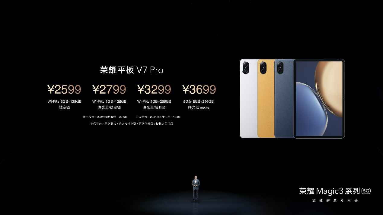 本次发布荣耀平板V7 Pro包含三款配色选择:晨晖金、曙光蓝、钛空银, 售价为2599起来,将于今日开始在荣耀商城、各大授权电商,荣耀体验店和荣耀授权店同步开启预售。